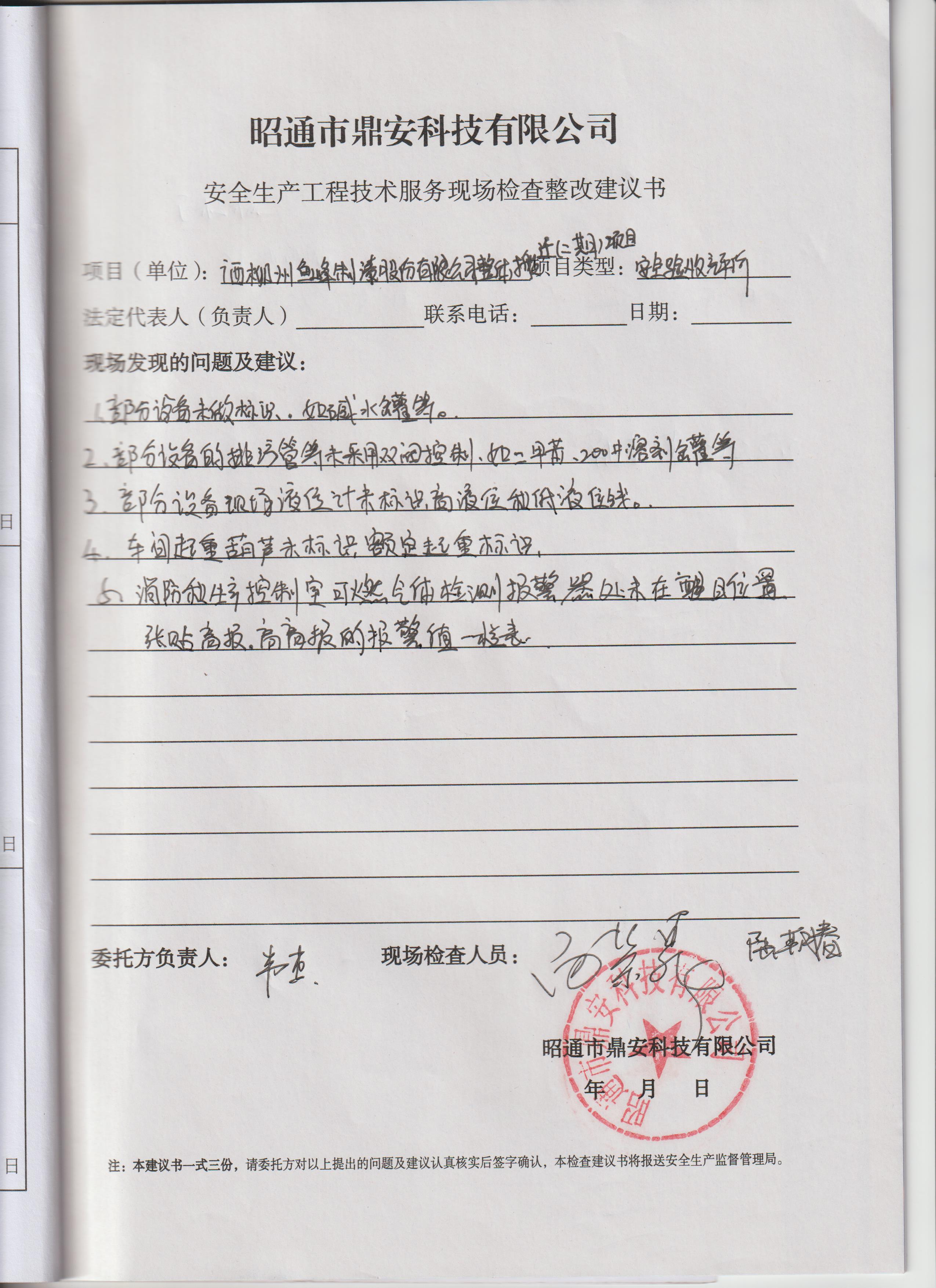 整改措施建議:1、應(yīng)定期請(qǐng)有資質(zhì)的防雷防靜電檢測(cè)單位對(duì)防雷裝置、防靜電裝置進(jìn)行檢測(cè),發(fā)現(xiàn)問(wèn)題及時(shí)處理。2、定期對(duì)生產(chǎn)廠區(qū)內(nèi)的消防設(shè)施進(jìn)行檢查,對(duì)消防器材和應(yīng)急物資進(jìn)行經(jīng)常性維護(hù)和保養(yǎng),以保證其有效性。3、對(duì)從業(yè)人員發(fā)生崗位變更的,應(yīng)重新進(jìn)行安全教育培訓(xùn),并經(jīng)換崗考試合格后持證上崗等。 | ||||||||