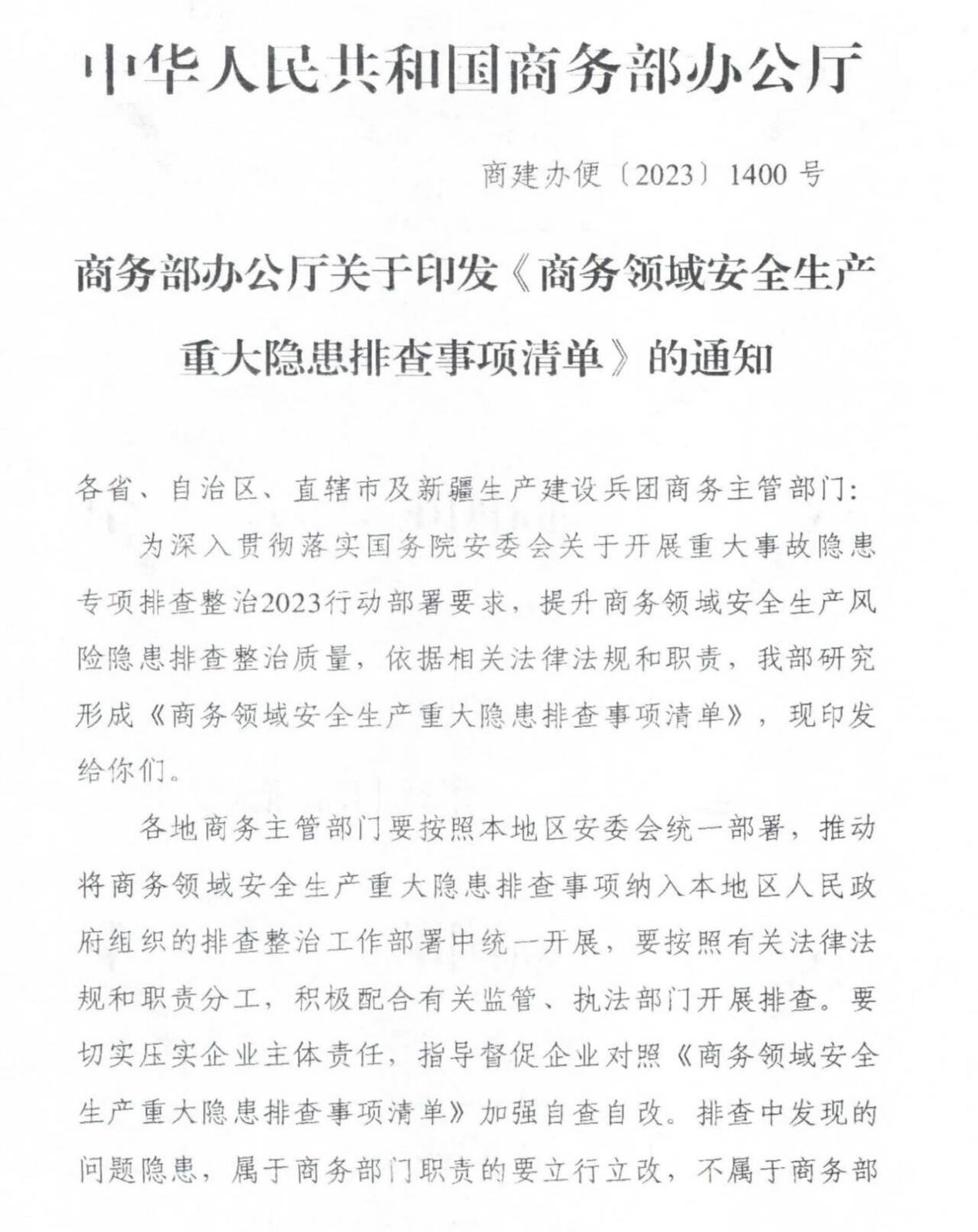 商務領域安全生產重大隱患排查事項清單