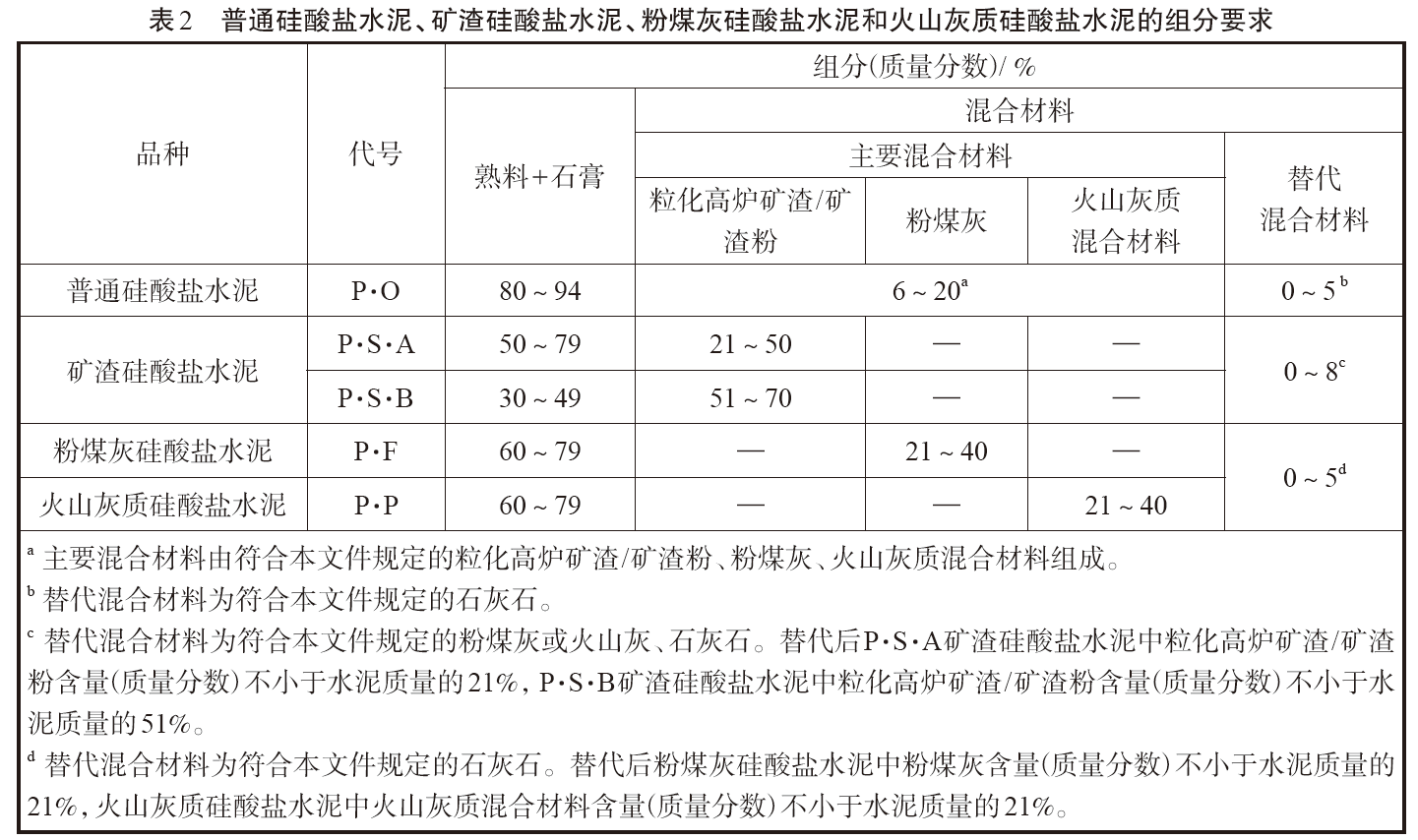 本次標準修訂為:主要混合材料的允許摻量為大于等于6% 且小于等于20%,其中可以使用小于等于5%的替代混合材料替代主要混合材料。這里的主要混合材料是指符合標準規定的?;郀t礦渣/ 礦渣粉、粉煤灰、火山灰質混合材料,可以是一種材料單獨使用也可以是兩種或三種材料復合使用。替代混合材料則指石灰石。具體見表2 中的備注a和b。