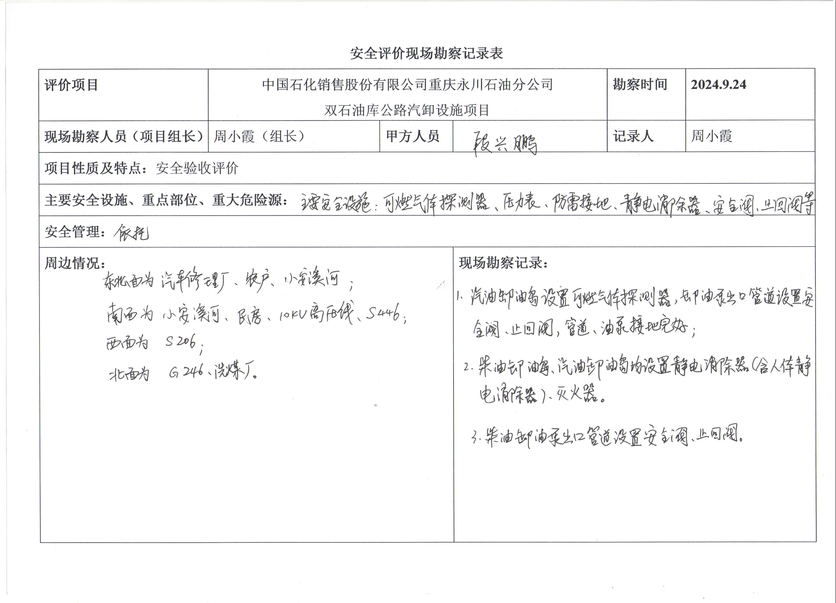 項目名稱 | 中國石化銷售股份有限公司重慶永川石油分公司雙石油庫公路汽卸設(shè)施項目安全驗收評價 | 合同編號 | DA(渝)PJ033 | |||||