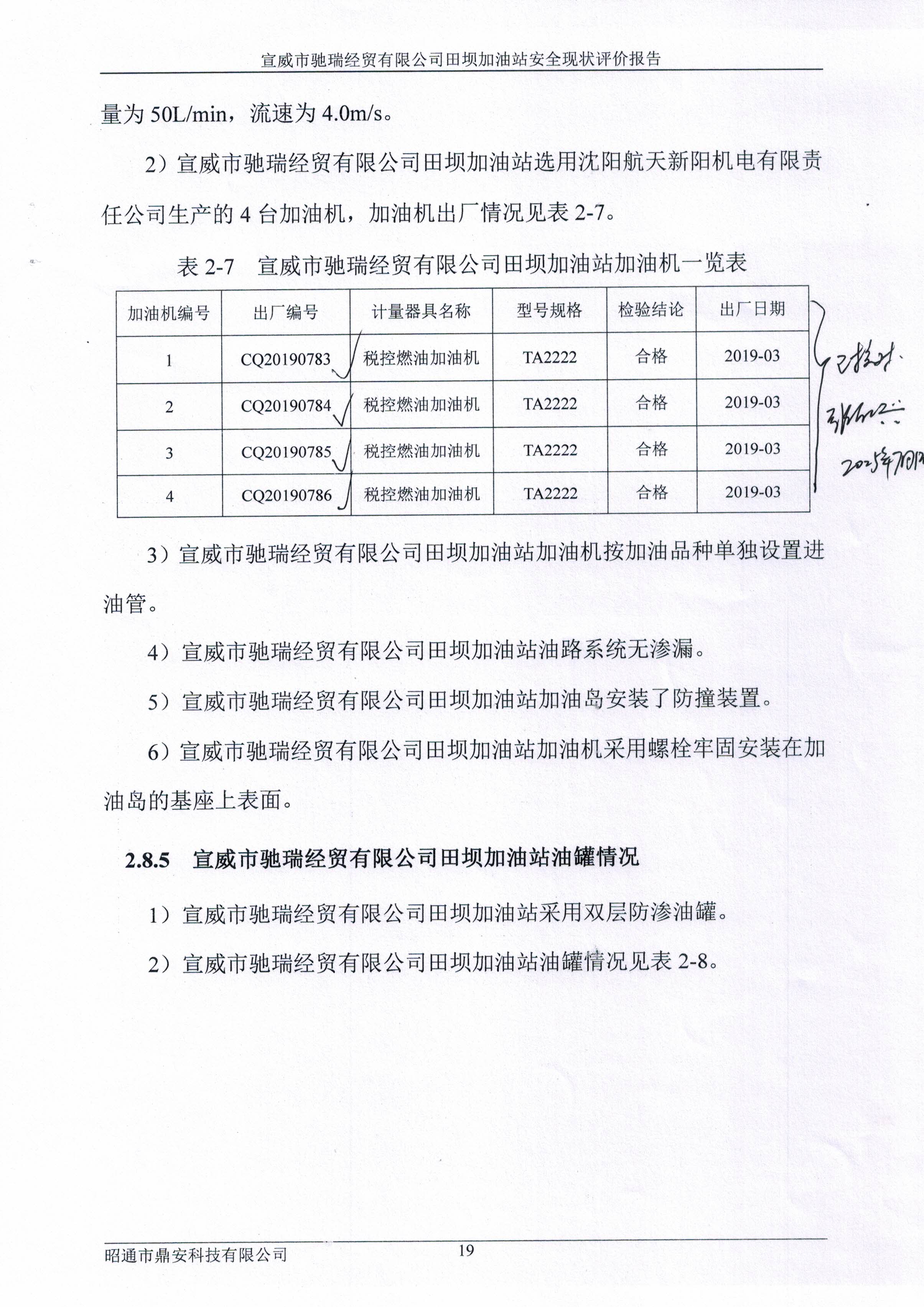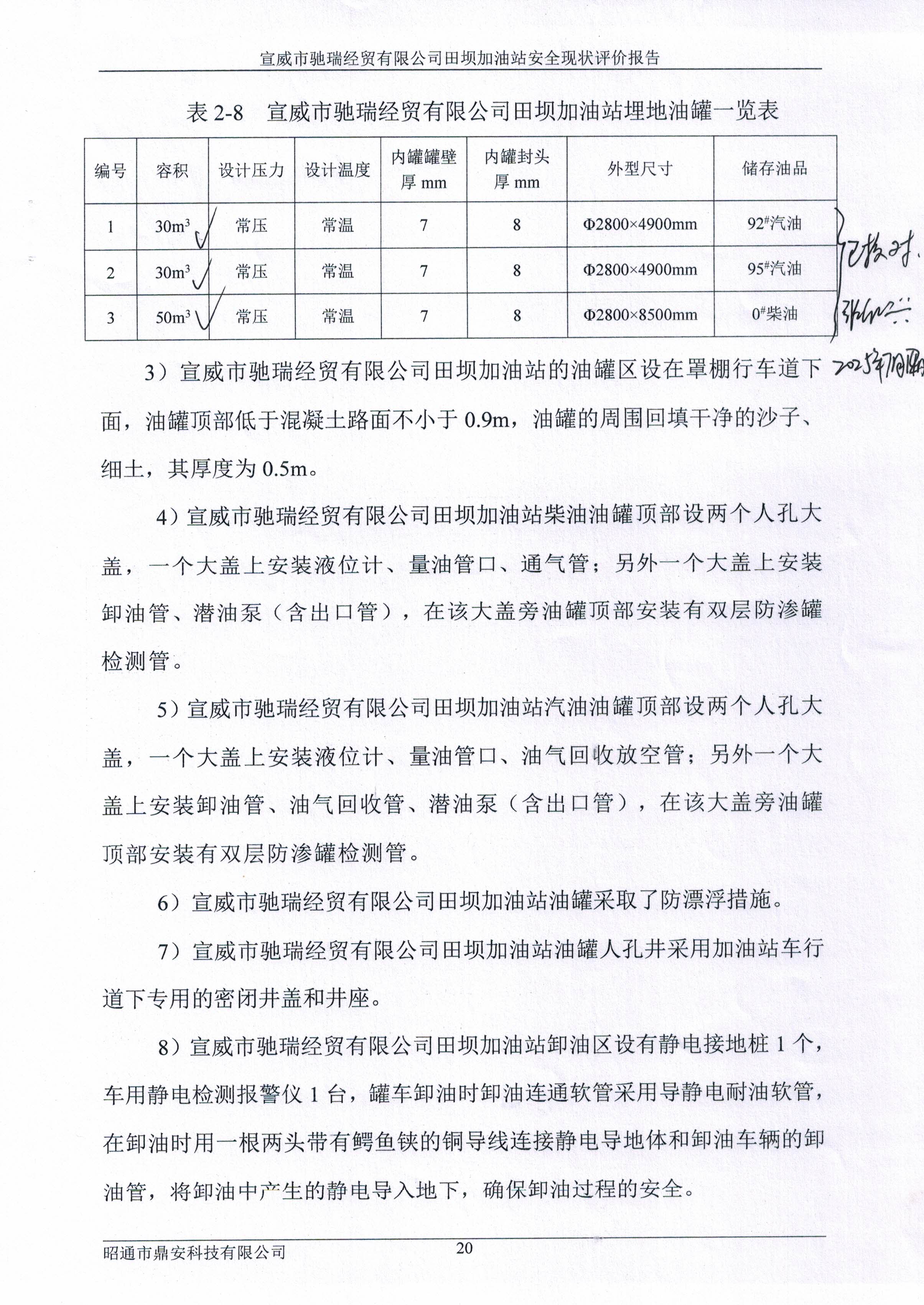 評價結論為:宣威市馳瑞經貿有限公司田壩加油站已完成本次評價發現的不符合項整改,站址選擇及平面布置、加油工藝及設施、消防設施、電氣及報警系統、建(構)筑物等方面符合《汽車加油加氣加氫站技術標準》(GB50156-2021)、《加油站作業安全規范》(AQ3010-2022)標準規定;經營場所、危險化學品儲存設施、人員配置及培訓考核、安全管理制度、安全操作規程、應急預案、應急物資滿足《危險化學品安全管理條例》(國務院令第591號,第645號修改)第三十四條、《危險化學品經營許可證管理辦法》(原國家安監總局令第55號公布,第79號修正)第六條要求,從安全的角度宣威市馳瑞經貿有限公司田壩加油站具備危險化學品經營的安全條件。 | ||||||||