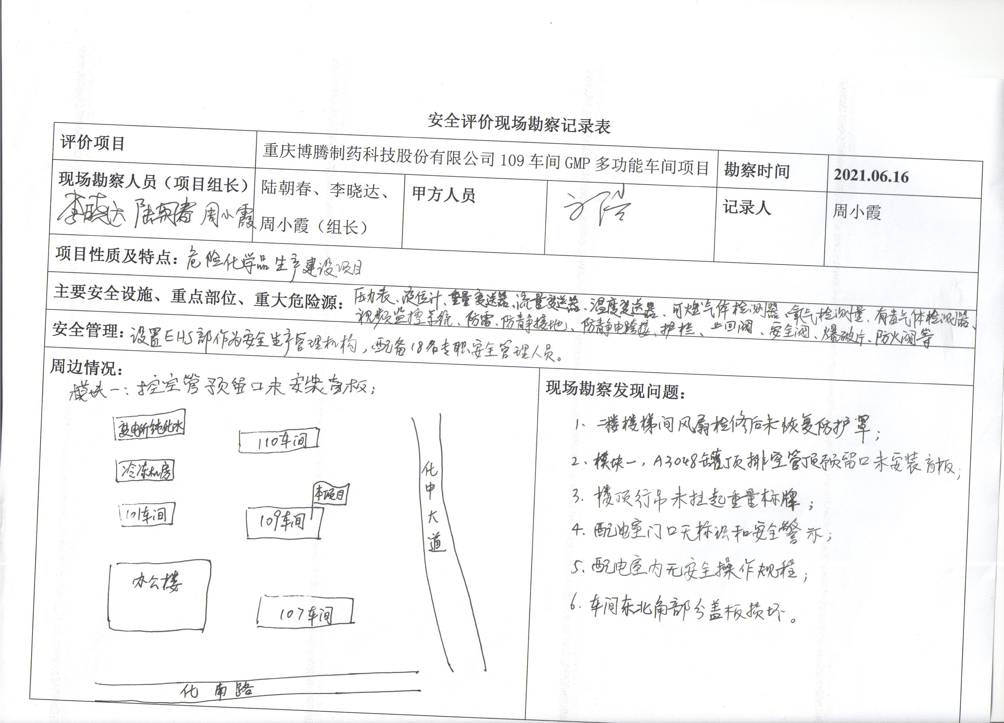 項目名稱 | 重慶博騰制藥科技股份有限公司109車間GMP多功能車間項目安全驗收評價 | 合同編號 | DA(渝)PJ-003 | |||||